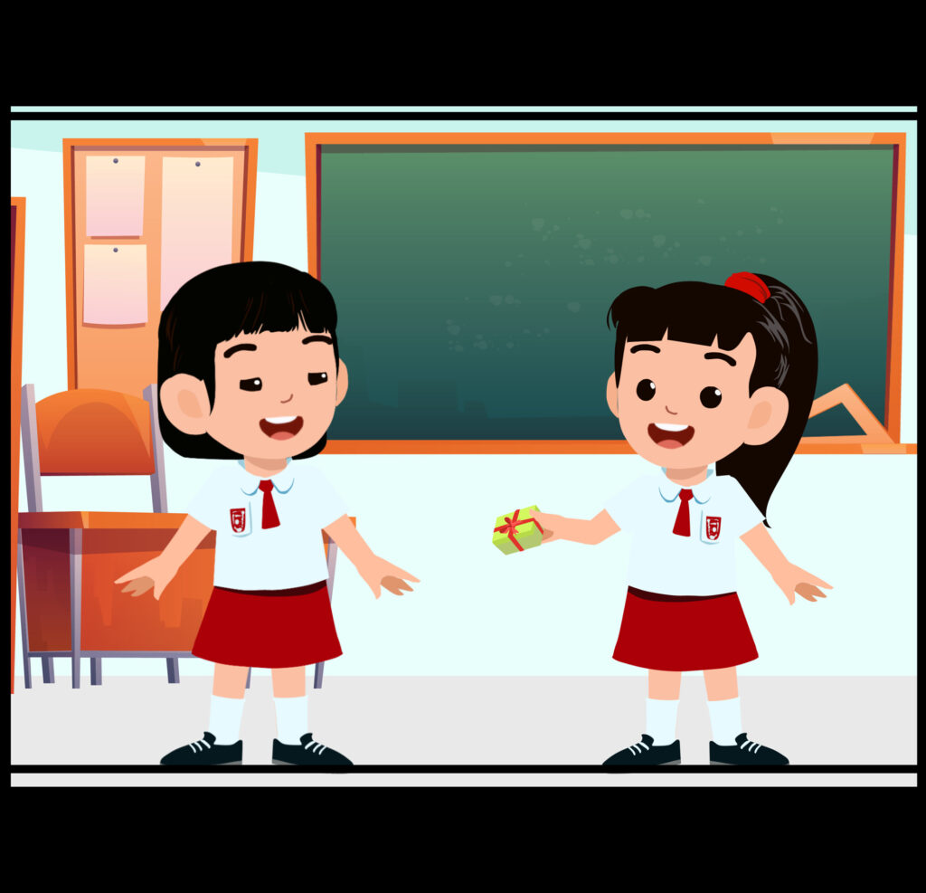 Pagi itu Melani membagi-bagikan oleh-oleh dari keluarganya yang datang dari China untuk teman-temannya. Kiki senang sekali menerimanya. Kiki berterima kasih kepada Melani. Adik-adik, Melani...